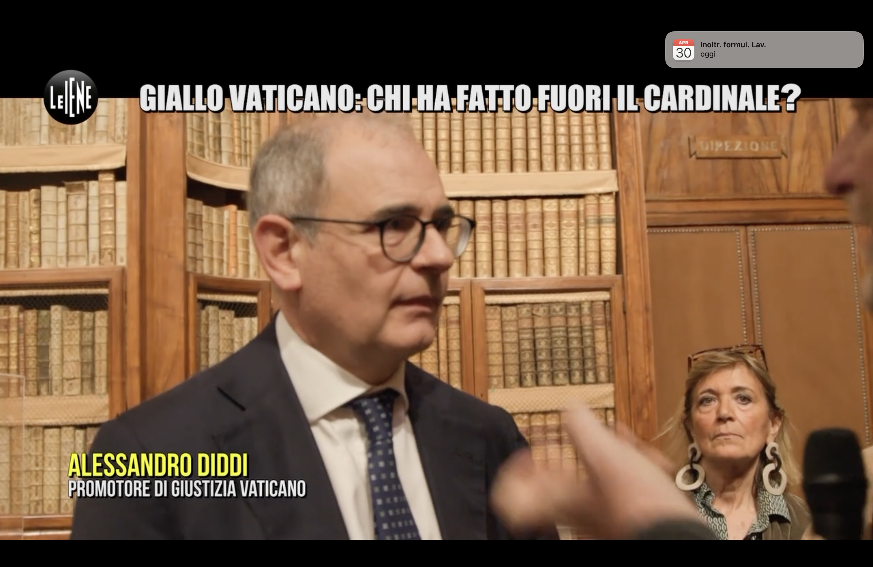 Alessandro Sortino e Marco Occhipinti, Giallo Vaticano: chi ha fatto fuori il cardinale?, in «Le Iene», Italia1, 29 aprile 2025. LA SPIEGAZIONE DELL'IMBROGLIO Francesca Immacolata Chaouqui afferma che Becciu faceva "cose losche", basandosi su quanto sostiene il grande accusatore Perlasca (al processo non c'è altra "prova"). Solo che, al capo dell'Ufficio amministrativo Perlasca, l'idea di addossare quelle colpe al suo superiore Becciu, l'aveva insufflata proprio lei, la "Papessa", manipolandolo con minacce, ricatti e allettamenti. Perlasca, che aveva appena perso il lavoro, è l'"utile idiota" che, in cambio delle sue menzogne, viene scagionato da ogni colpa, benché fosse il vero responsabile dei traffici incriminati, e anzi ottiene la promessa di un posto di lavoro attraente («io di questo sono certa e sicura», sostiene la Chaouqui): profezia che puntualmente si avvera, visto che Perlasca sarà assunto nella magistratura vaticana. Chaouqui – mossa unicamente da uno spirito di vendetta – risulta insomma essere l'alfa e l'omega dell'intera operazione. La domanda a questo punto è: fino a dove arriva l'influenza di questa donna? Come e perché dispone di tanto potere? Sta forse ricattando qualcuno? Con lei, dice, «nessuno è al sicuro». Evidentemente l'imbroglio si basa su un loschissimo "do ut des" in cui la salvezza di Perlasca viene concessa in cambio della cacciata e della condanna di Becciu, conseguendo così la vendetta della Chaouqui: «un'opera ciclopica», dicono. Al processo le testimonianze di Chaouqui e di Perlasca risultano per questo piene di perfide menzogne. La Ciferri da parte sua, stravagante amica di Perlasca, funge da trait d'union tra i due. E gli inquirenti? Da quanto risulta in questo video, il commissario De Santis suggeriva a Chaouqui ciò che Perlasca avrebbe dovuto dire al processo: una manipolazione di testimone, che poi era un modo per scagionare il vero colpevole. Da parte sua Chaouqui, mentendo, afferma di non avere nulla a che vedere con il magistrato Diddi e con lo stesso De Santis: «Io non conosco Diddi, non ho niente a che fare con la gendarmeria, non ho niente a che fare con il processo», si precipita a dichiarare. Solo che al processo Perlasca va in panico e non regge la pressione, perde completamente credibilità. Ecco perché l'amica Ciferri in quei giorni inonda di messaggi chat lo stesso Diddi: perché, a torto o a ragione, è convinta che il magistrato sia una pedina dell'imbroglio (Chaouqui sostiene d'avere una stretta collaborazione con lui, e realmente le conferme sono moltissime) e lo vuole quindi sollecitare a difendere maggiormente il suo sodale Perlasca. E Diddi che fa? Clamoroso: occulta – gravissimamente – i messaggi che risulterebbero utili alla difesa di Becciu e, benché ci sia una notizia di reato, non istruisce alcuna indagine contro la Chaouqui, perché – ammette lui stesso – «in un modo o nell'altro potrei avere un duplice ruolo»: uno scandaloso conflitto di interessi. Inoltre il magistrato mente affermando d'aver bloccato immediatamente la Ciferri sul suo telefonino. Al bravo giornalista Alessandro Sortino, che lo smaschera, dice: «Ma se lei conosce le cose, perché mi fa le domande?», proprio come risponderebbe un imputato colto in castagna. E il giudice Pignatone, perché accetta i giochi sporchi di Diddi? E che ruolo svolgono Parolin, Peña Parra e il "cerchio magico" attorno al Papa in tutto questo? La Ciferri afferma inoltre che la Chaouqui – come Giuda era strato pagato con 30 denari – le ha chiesto 30'000 euro per cotanto servizio di intermediaria con la magistratura; lei ne avrebbe pagati solo 15'000, recapitati attraverso un sindaco della zona. La "Papessa" lo nega – «non ho mai preso un centesimo; non ho mai preso soldi, questo è sicuro» –; ma il sindaco conferma d'averle consegnato il "pacco". Giustamente il giornalista Sortino si domanda: «Ma perché Chaouqui non è mai stata chiamata in Vaticano a deporre?». Poniamoci anche noi questa domanda e cerchiamo una risposta convincente! «Papa Francesco nei suoi ultimi anni di vita potrebbe essere stato vittima di un inganno? Ci potrebbe essere stato un complotto per far fuori uno dei cardinali più influenti per l’elezione del nuovo Papa?» Intanto, contro la malagiustizia vaticana, è stata presentata una denuncia all'ONU! Condividiamo, gente, diffondiamo questo video nel mondo intero! E guardate chi c'era al fianco di Diddi: la "giornalista" servile e velenosa che – complice di una magistratura corrotta, facendosi portavoce di Diddi – ha montato la più violenta e volgare campagna di diffamazione contro un essere umano innocente. -