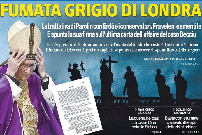 Felice Manti, Si (ri)apre l'indagine vaticana sulle chat del processo Becciu, in «Il Giornale», 7 maggio 2025. «Sono due anni che c'è un'indagine su queste conversazioni «omissate» dallo stesso Diddi. Nel corso del processo, era emerso che Perlasca aveva riferito a De Santis che avrebbe incontrato Becciu alla famosa cena del 5 settembre 2020 al ristorante romano Lo Scarpone, al Gianicolo. Per quale motivo l'avrebbe informato? Era parte della «macchinazione» che oggi lamentano i legali di Becciu? Le due donne millantano anche un ruolo di Pietro Parolin: «Fa la gatta morta, ma... molte cose le sa benissimo, e le ha sempre sapute», dice la Ciferri. Ma che c'entra lui? Come documentato dal Tempo, c'è la sua firma sul via libera all'affare del palazzo di Londra che ha portato alla condanna di Becciu. Il memorandum sull'affarre di Sloane Avenue, nato su idea Credit Suisse di Londra, è datato 25 novembre 2018, quando Becciu era alla Congregazione dei santi. Eppure sarebbe stato costretto al passo indietro sul Conclave «per assecondare la volontà di Papa Francesco», suggellata nelle due lettere firmate F e diffuse dallo stesso Parolin. Le chat - 2.500 pagine circa di fitte conversazioni - sono state consegnate dalla Ciferri al broker Raffaele Mincione, infangato da un processo a suo dire «ingiusto», tanto da rivolgersi all'Onu. Nei giorni scorsi il finanziere ha anche ottenuto la condanna della Santa Sede a rifondere 1,5 milioni di spese legali dopo la condanna decisa dal Tribunale vaticano diretto da Giuseppe Pignatone. «Becciu è stato escluso dal Conclave perché condannato o è stato condannato per farlo fuori dal Conclave?», è la domanda che circola da giorni in Vaticano.» SI SVEGLIANO ALL'ULTIMO MINUTO IN VATICANO? SE LA MAGISTRATURA DEVE INDAGARE SULL'OPERATO DELLA MAGISTRATURA E DELLA GENDARMERIA... -