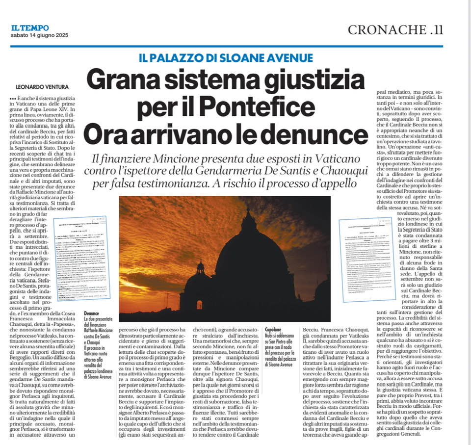 Leonardo Ventura, Grana sistema giustizia per il Pontefice. Ora arrivano le denunce, in «Il Tempo», 14 giugno 2025. LO SCANDALO PIÙ GIGANTESCO NELLA CHIESA DEGLI ULTIMI SECOLI: QUELLO DELLA MALAGIUSTIZIA. «Quanto sta emergendo con sempre maggiore forza sermbra dar ragione a chi da tempo, soprattutto dopo aver seguito l'evoluzione del processo, sostiene che l'inchiesta sia stata caratterizzata da evidenti anomalie e la condanna del Cardinale Becciu e degli altri imputati sia sostenuta da prove fragili, figlie di un teorema che aveva grande appeal mediatico, ma poca sostanza in termini giuridici. In tanti poi – e non solo all'interno del Vaticano – sono convinti, sopratuto dopo aver scoperto, seguendo il processo, che il Cardinale Becciu non si è appropriato neanche di un centesimo, che si sia trattato di un'operazione studiata a tavolino. Un'operazione "anti-casta", sfruttata per mettere fuori gioco un cardinale divenuto troppo potente. Non è un caso che ormai siano rimasti in pochi a difendere la gestione dell'indagine nei confronti del Cardinale e che proprio lo stesso ufficio del Promotore sia stato costretto ad aprire un'inchiesta contro una testimone della stessa accusa. Né va sottovalutato, poí, quanto emerso nel giudizio londinese in cui la Segreteria di Stato è stata condannata a pagare oltre 3 milioni di sterline a Mincione, non ritenuto responsabile di alcuna frode in danno della Santa sede. L'appello di settembre non sarà solo un giudizio sul Cardinale Becciu, ma dovrà riportare in alto la considerazione di tanti sull'intera gestione del processo. La credibilità del sistema passa anche attraverso la capacità di riconoscere se nell'ambito di un'inchiesta qualcuno ha abusato o si è costruito ruoli da castigamatti, pur di raggiungere l'obiettivo. Perché se testimoni sono stati orientati, gli investigatori hanno agito fuori ruolo e l'accusa ha coperto chi manipolava, allora a essere sotto accusa non sara più un Cardinale, ma la giustizia vaticana stessa.» CHE ORRIBILE PUZZA DI MARCIO IN VATICANO!
