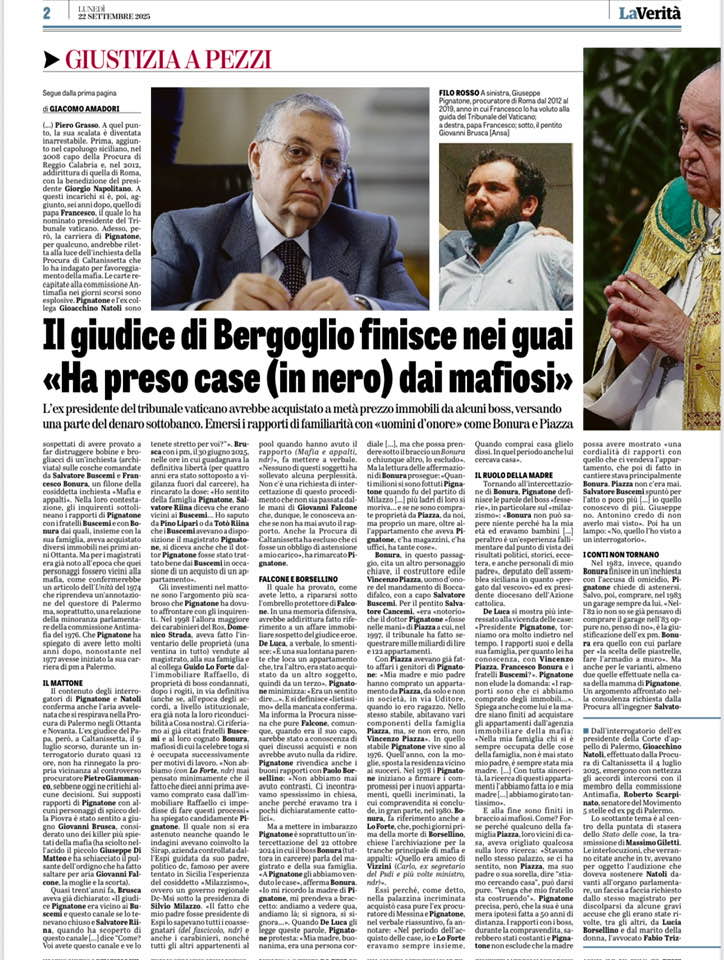 Giacomo Amadori, L'accusa al giudice di Bergoglio: «Comprò case in nero dai mafiosi», in «La Verità», 22 settembre 2025. QUESTO SOGGETTO – IL GIUDICE VATICANO GIUSEPPE PIGNATONE, GIÀ INDAGATO PER FAVOREGGIAMENTO ALLA MAFIA! – HA CONDANNATO UN INNOCENTE, IL CARDINALE GIOVANNI ANGELO BECCIU. PIGNATONE È UNA PERSONA RICATTATA/-BILE DALLA MAFIA?