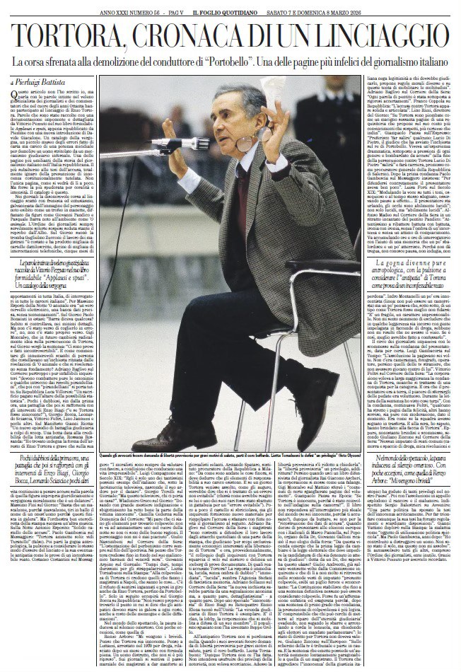 Pierluigi Battista, Tortora, cronaca di un linciaggio, in «Il Foglio», 7 marzo 2026. Non solo malagiustizia. Ma uno schifoso giornalismo, servile e mafioso. Ieri con Enzo Tortora come oggi con Angelo Becciu.