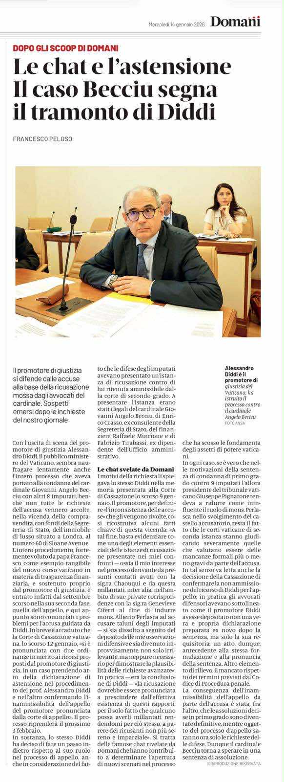 Franca Giansoldati, Vaticano, via il Promotore di Giustizia: Diddi f amarcia indietro e si «astiene» dal processo Becciu, era ormai incompatibile, in «Il Messaggero», 12 gennaio 2026. «E' la sua uscita di scena definitiva. IN questo modo Diddi offre la possibilità al processo vaticano di riprendere l'iter in appello senza subire ulteriori contraccolpi, senza le tensioni continue e la montagna di sospetti che sinora si erano intrecciati in questa ingarbugliata vicenda processuale che ha portato alla condanna - in primo grado - di nove persone tra cui il cardinale Angelo Becciu il quale si era però sempre proclamato innocente. Per certi versi la decisione della Cassazione (composta dai cardinali Farrell, Zuppi e Artime) costituiva una sorta di test collaterale sul pontificato in corso, e sulla sua capacità effettiva di garantire in Vaticano processi giusti, cosa che finora è sempre stata contestata con forza non solo dalle difese degli imputati ma da una folta schiera di giuristi, canonisti e cardinali. L'appello del processo per il Palazzo di Londra si era aperto in ottobre in modo piuttosto scoppiettante. Le difese di quattro degli imputati, il cardinale Angelo Becciu, i finanzieri Enrico Crasso e Raffaele Mincione e l'ex funzionario della Segreteria di Stato, Fabrizio Tirabassi avevano ricusato il Promotore di Giustizia, Alessandro Diddi per avere avuto «un interesse nel procedimento» come si evince dai tanti messaggi intercorsi tra la pr Francesca Chaouqui e Genoveffa Ciferri, le due donne che hanno ispirato ispirato su differenti livelli, il memoriale di monsignor Alberto Perlasca, principale accusatore del cardinale Becciu. In pratica Chaouqui, avrebbe manipolato il monsignore (per il tramite di Ciferri) agendo dietro le quinte e in contatto con il Promotore di Giustizia Diddi. Per la Corte d'Appello, formata dallo spagnolo monsignor Alejandro Arellano Cedillo (proveniente dai vertici della Rota Romana) e da due giudici laici, la richiesta era stata giudicata ammissibile e ora a Corte di Cassazione (formata dai cardinali, Zuppi, Lojudice, Gambetti, Farrell e da Artime) pronunciarsi in merito. (...) Dentro e fuori la Chiesa l'appello del cosiddetto processo Becciu viene considerato il primo, consistente, test del nuovo corso per misurare trasparenza e coerenza nell'amministrazione della giustizia da parte di Leone XIV. Il Papa ha in un paio di circostanze fatto sapere che non si sarebbe intromesso in alcun modo, cosa che, invece, non fece il suo predecessore entrando a gamba tesa con quattro rescripta per modificare la gestione delle indagini a processo in corso, ai danni del le difese e del cosiddetto “giusto processo”. La vicenda era partita dalla richiesta di un prestito della Segreteria di Stato allo Ior per un totale di 150 milioni di euro per riacquistare le quote della società che controllava un immobile di pregio a Londra. Da lì si è sviluppata una vicenda carica di zone d'ombra, giochi di potere, opacità. In primo grado sono affiorate persino false testimonianze, con agenti segreti più volte tirati in ballo, ipotesi di registrazioni illegali sul suolo italiano da parte di gendarmi vaticani, la presenza di suggeritori dietro le quinte per manipolare il principale accusatore del cardinale Becciu, un tempo responsabile dell'ufficio finanziario: monsignor Alberto Perlasca. Il primo legale che ha voluto commentare questo evento è Cataldo Intrieri che assieme a Massimo Bassi, difensori di Tirabassi, ritengono «saggia la decisione del professor Diddi, a conferma della legittimità delle questioni poste dalla difesa sulle oscure trame di depistaggio durante le indagini volute per la vicenda di Sloane avenue. Ora non resta che trarne le dovute conseguenze . Una pagina buia che confidiamo si chiuda presto e definitivamente». Anche in francese. E in tedesco. E in spagnolo. E in inglese.