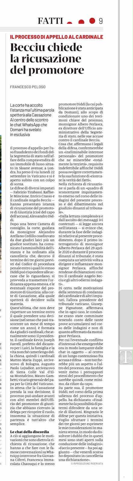 Francesco Peloso, Becciu chiede la ricusazione del promotore, in «Domani», 22 settembre 2025. «... l'eventuale conflitto d'interessi che emergerebbe ora in modo lampante dalle chat in – al centro di un lungo contenzioso fra accusa e difesa – non toccherebbe più un aspetto o l'altro del processo, ma farebbe venir meno i presupposti stessi del procedimento che sarebbe quindi, come minimo da rifare da capo.»