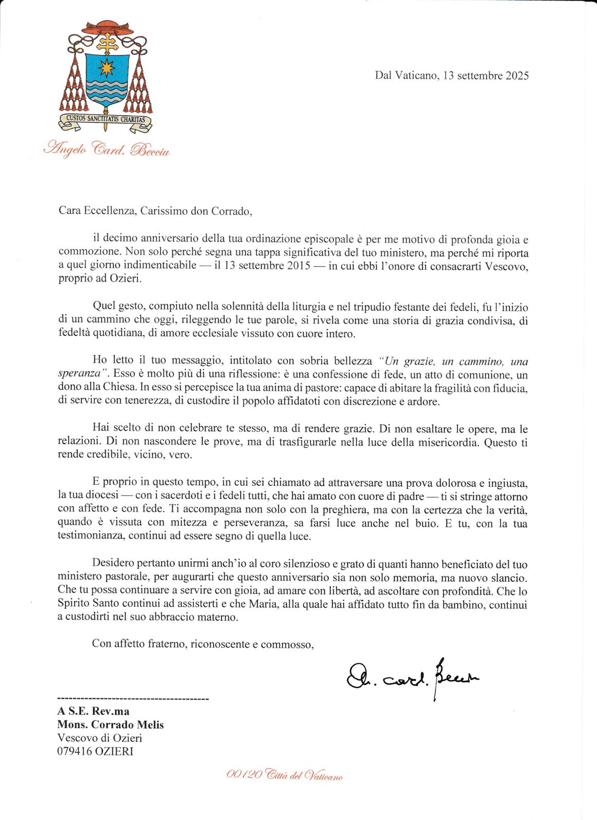Giovanni Angelo Becciu, Lettera al vescovo Corrado Melis, 13 settembre 2025. -