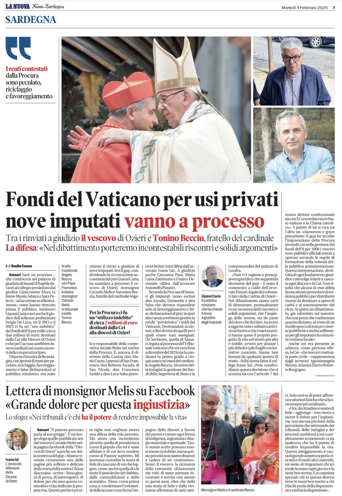 Il vescovo di Ozieri, ingiustamente perseguitato, protesta per il rinvio a giudizio in una lettera che gronda legittima indignazione, in «Faro di Roma», 3 febbraio 2025. "CHI TOCCA I FILI MUORE". CHI DIFENDE BECCIU E LA VERITÀ ENTRA NEL MIRINO DELLA (MALA)GIUSTIZIA. E la persecuzione continua. -