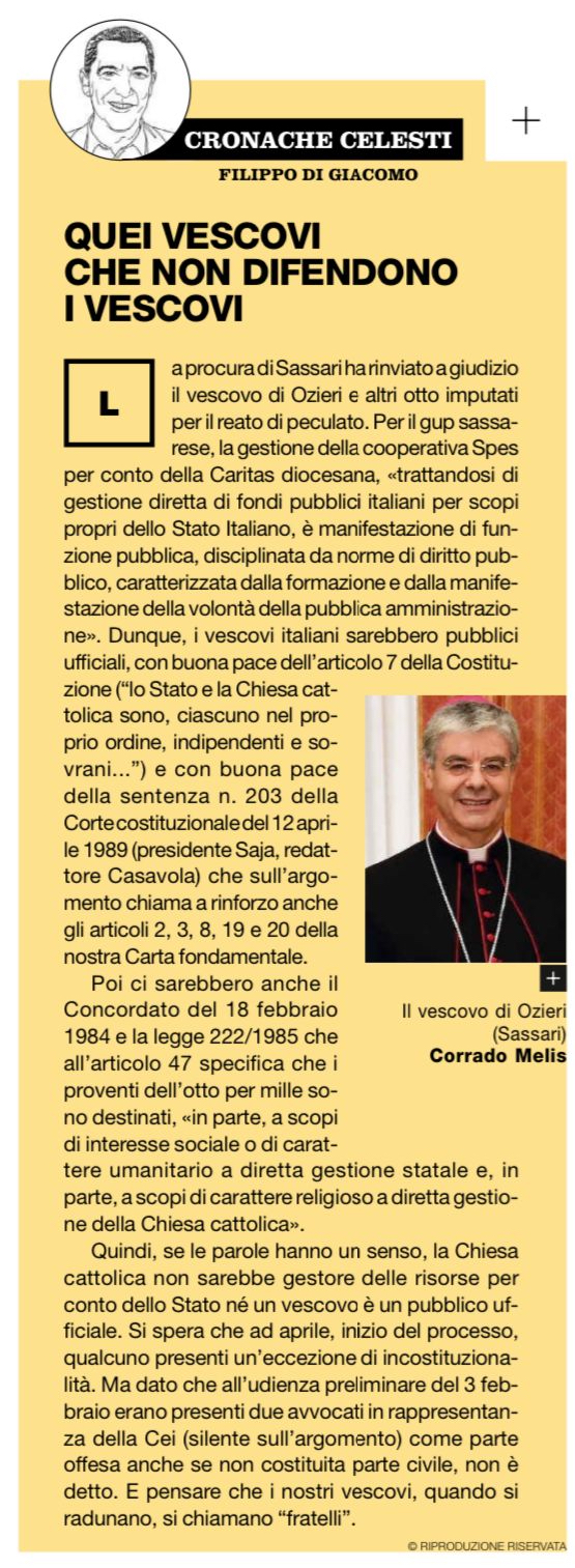 Nico Spuntoni, La procura non può mettere il naso nella gestione dell'8 per mille, in «La Nuova Bussola Quotidiana», 10 gennaio 2025. QUANDO SI COMMETTE UN ERRORE BISOGNEREBBE AMMETTERLO E RIMEDIARE. INVECE CI SI INCAPONISCE DIETRO TEORIE ASSURDE, ARRAMPICANDOSI SUGLI SPECCHI E CAUSANDO DANNI SU DANNI. «Può, infatti, una procura italiana contestare ad una diocesi la destinazione di fondi dell'8 per mille? Lo scorso marzo monsignor Melis aveva respinto le accuse sostenendo che «è trasparente e non negoziabile la finalità degli aiuti della Cei» e rivendicando di aver aiutato gli svantaggiati del territorio con le donazioni attraverso la Caritas diocesana e «attraverso il suo “braccio operativo”, la Spes, la cooperativa sociale di tipo B nata proprio per il reinserimento lavorativo di persone dai vissuti travagliati». (...) Per questo il rinvio a giudizio di monsignor Melis a Sassari non è cosa da poco. La materia, infatti, tira in ballo l'accordo di Villa Madama ed in particolare l'articolo 48 che riconosce alla Chiesa cattolica l'utilizzo dei soldi dell'8 per mille «per esigenze di culto della popolazione, sostentamento del clero, interventi caritativi a favore della collettività nazionale o di Paesi del terzo mondo». Geraldina Boni, Manuel Ganarin e Alberto Tomer hanno fatto notare in un articolo scientifico sull'argomento pubblicato sulla rivista "Stato, Chiese e pluralismo confessionale" che "sarebbe paradossale e, per quanto qui preme, non in linea con quel self-restraint cui la Repubblica laica deve severamente attenersi nei confronti delle estrinsecazioni del sentimento religioso, che si andasse a sindacare come, da parte confessionale, vengano esaudite le esigenze di culto della popolazione, ovvero come la Conferenza Episcopale Italiana deliberi di concretizzare gli interventi caritativi. L’allocazione e l’uso dei fondi sono tassativamente limitati al raggiungimento di quegli scopi, ma sulle modalità pratiche e circostanziate di tale impiego ci si rimette alla libera discrezionalità della Chiesa, l’unica in grado di giudicare in proposito".» -