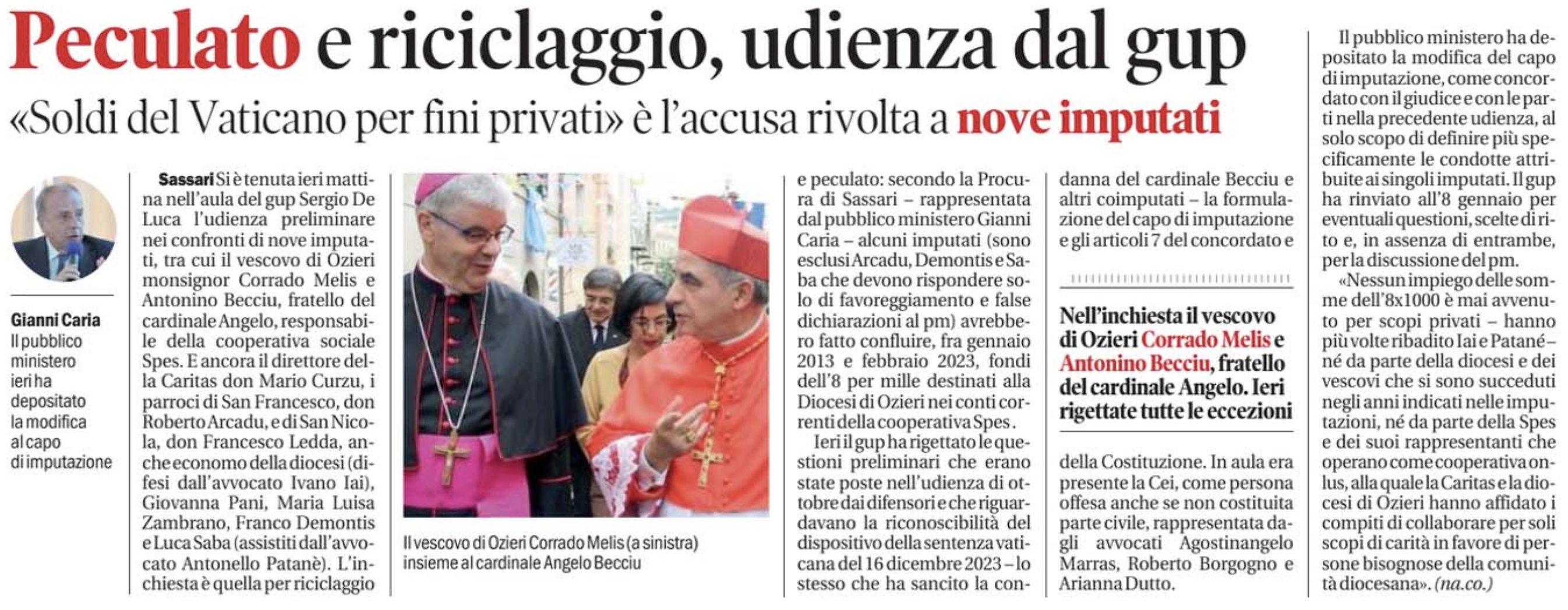 MA "CHI TOCCA I FILI MUORE": CHI DIFENDE BECCIU E LA VERITÀ SI ESPONE A RAPPRESAGLIE, ENTRA NEL MIRINO DELLA (MALA)GIUSTIZIA. 3 febbraio 2025: il vescovo di Ozieri e altre otto persone vengono rinviate a giudizio, secondo i legali violando la Costituzione italiana e il Concordato.