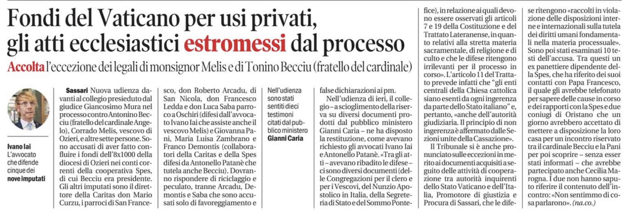 Processo a Tonino Becciu: respinti molti atti depositati dal pm, in «L'Unione Sarda», 25 marzo 2026. -