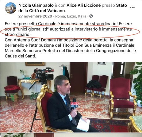 Calomnie contre le cardinal Becciu: la justice vaticane condamne l'instigateur du scandale, in «Tribune Chrétienne», 31 ottobre 2025. «Cette condamnation survient après des années de rumeurs, d’insinuations et de campagnes médiatiques qui ont porté atteinte à la réputation du cardinal Becciu. Les déclarations de Giampaolo, jugées mensongères et gravement diffamatoires, avaient été présentées par Report comme des éléments-clés d’une enquête télévisée ayant largement contribué à ternir l’image du prélat. Le tribunal du Vatican a établi que ces accusations étaient sans fondement et constituaient une volonté manifeste de nuire. Le cardinal Becciu, reconnu comme partie lésée, a vu ainsi réaffirmée son innocence, après des années de souffrance morale et de suspicion publique. (...) De leur coté les avocats Fabio Viglione et Maria Concetta Marzo, défenseurs du cardinal Becciu, ont salué la décision comme une victoire du droit et de la vérité : «Le tribunal a pleinement accueilli notre thèse sur la nature du délit, appuyée par le promoteur de justice. Cette sentence est importante, car elle reconnaît que le cardinal Giovanni Angelo Becciu a été injustement et faussement accusé de comportements graves qu’il n’a jamais eus, subissant un préjudice considérable à sa réputation. »Pour le cardinal, cette décision constitue une étape essentielle de sa réhabilitation après une longue épreuve personnelle et médiatique.Au-delà de la dimension judiciaire, cette affaire soulève des questions fondamentales sur le rôle et la responsabilité des médias, en particulier du service public. La crédibilité accordée à Giampaolo par les auteurs de Report, sans vérification suffisante, met en lumière les dérives d’un journalisme d’enquête parfois guidé davantage par la recherche du scandale que par la quête de vérité. (...) La sentence du 29 octobre ne clôt pas seulement une affaire judiciaire : elle ouvre une réflexion plus large sur la protection de la dignité des personnes et sur l’usage responsable des outils médiatiques. Elle rappelle que la liberté d’informer exige rigueur, discernement et respect de la vérité.Pour l’Église, cette décision du tribunal vatican constitue un signe fort de transparence et de justice, conforme à l’esprit voulu par le pape Léon XIV, qui n’a cessé de rappeler que «la vérité, servie dans la charité, demeure la première exigence de toute communication chrétienne».»