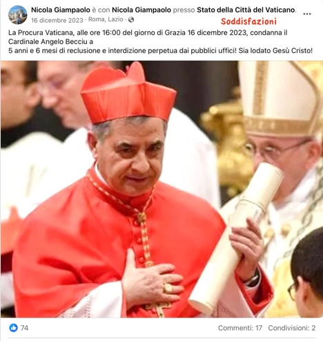 Caso Becciu: condannato per calunnie Nicola Gianpaolo, in «Catt.ch», 31 ottobre 2025. «La sentenza arriva dopo anni di illazioni e campagne mediatiche che hanno contribuito a gettare un’ombra sul nome del cardinale Becciu, accusato pubblicamente di condotte mai dimostrate e oggi riconosciute proprio come false. Gianpaolo — figura ritenuta credibile dagli autori di Report e presentata come testimone di rilievo nell’inchiesta televisiva — è stato ritenuto responsabile di aver diffuso dichiarazioni calunniose che hanno alimentato una narrazione infondata e gravemente lesiva della reputazione del cardinale.» Se la Chiesa italiana è ancora in profondo letargo (oh, arriverà il risveglio!), pare che quella svizzera abbia cominciato a svegliarsi...