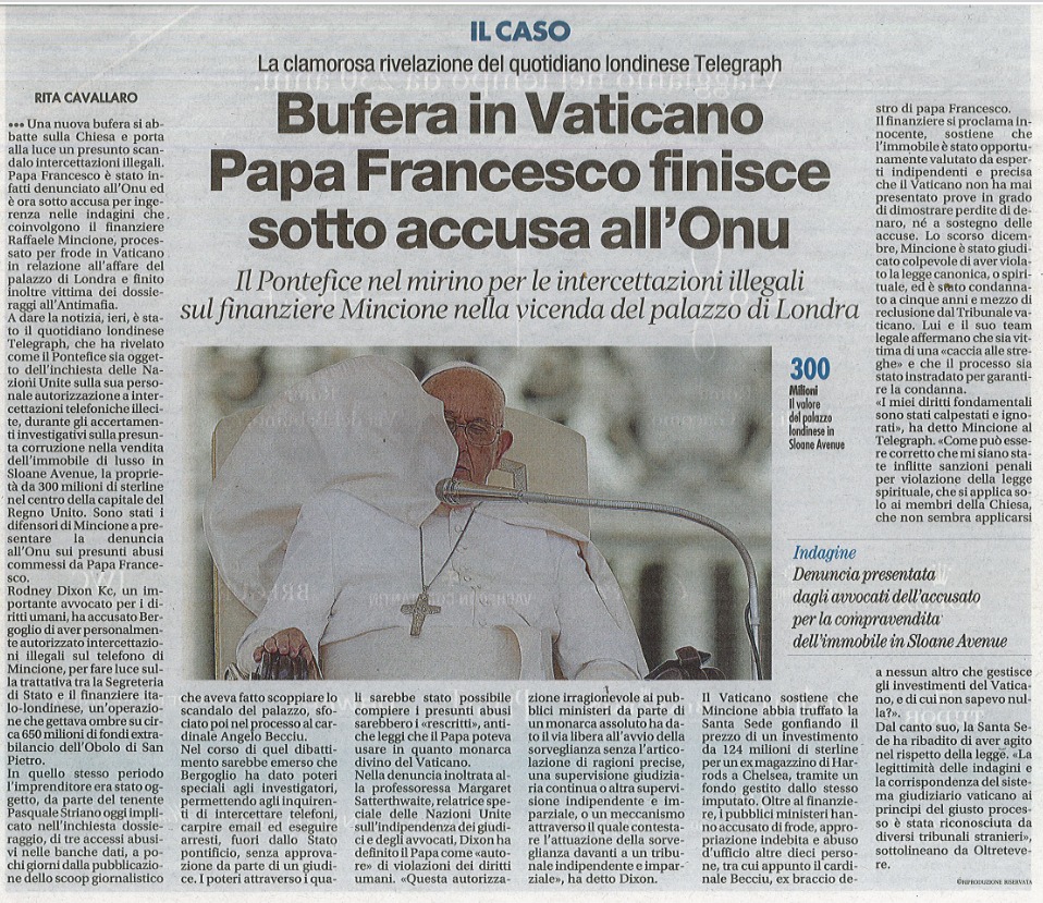 Francesco Peloso, Grosso guaio a Sloane Avenue: il Vaticano alla sbarra a Londra, in «Domani», 28 giugno 2024. «... carte alla mano, il Vaticano – tramite mons. Alberto Perlasca (capo ufficio amministrativo all’epoca dei fatti), lo stesso mons. Edgar Peña Parra, il cardinale Pietro Parolin, Segretario di Stato – aveva dato il proprio placet all’operazione con tanto di firme sotto i contratti relativi alla compravendita dell’immobile, e lo stesso papa Francesco era stato informato dell’operazione. (...) POTERE ASSOLUTO Inoltre, sostengono gli avvocati di Mincione nel loro ricorso, «non è chiara quale sia l’esatta base giuridica della sua condanna in assenza di accertamenti» da parte del Tribunale vaticano, tuttavia «sembra basarsi su una disposizione di diritto canonico relativa all’amministrazione dei beni ecclesiastici», come si legge in effetti nel comunicato finale relativo alla sentenza di condanna, e qui si contesta ovviamente per quale ragione il finanziere fosse tenuto a conoscere una legge della Chiesa. Pure per tale motivo Mincione si è rivolto alle Nazioni Unite, cioè per avere un giudizio di condanna dell’operato del Vaticano nel corso del processo (Mincione non si può appellare alla corte europea dei diritti dell’uomo perché la Santa Sede non aderisce al Consiglio d’Europa). Su questo crinale si apre del resto, pure il tema del “giusto processo” e dell’indipendenza dei magistrati del papa. Fra le altre cose, è in discussione il potere assoluto del pontefice che ha modificato i poteri d’indagine dei promotori di giustizia attraverso quattro “rescripta” di cui le difese degli imputati non erano neanche a conoscenza.»